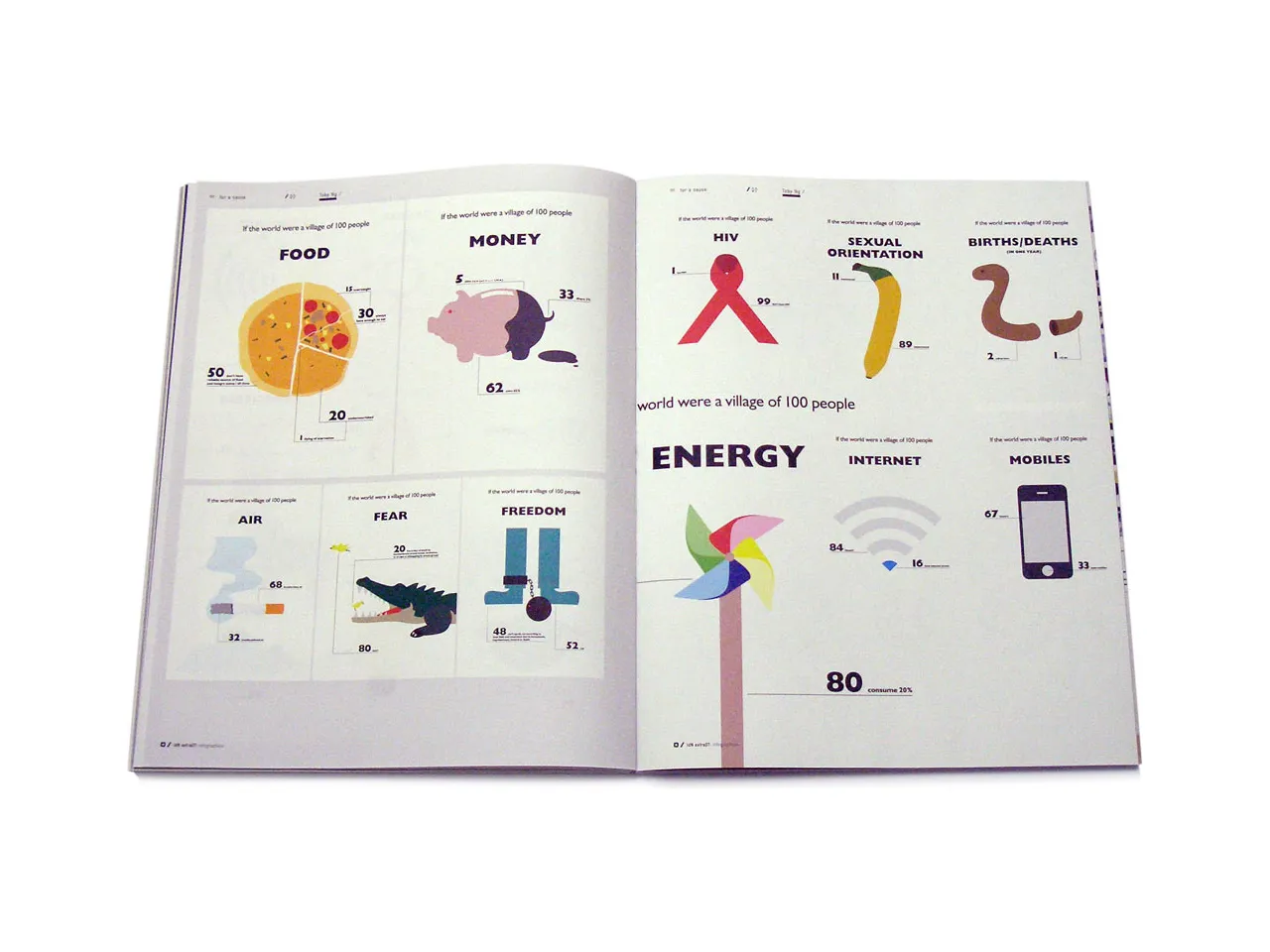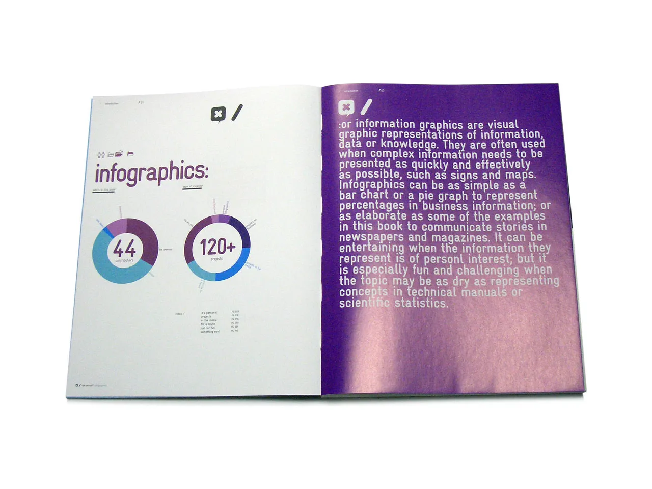 Infographics or information graphics are visual representations of information, data or knowledge. They are often used when complex information needs to be presented as quickly and effectively as possible, such as signs and maps. Infographics can be as simple as a bar chart or a pie graph to represent percentages in business information; or as elaborative as some of the examples in this book to communicate stories in newspapers and magazine.